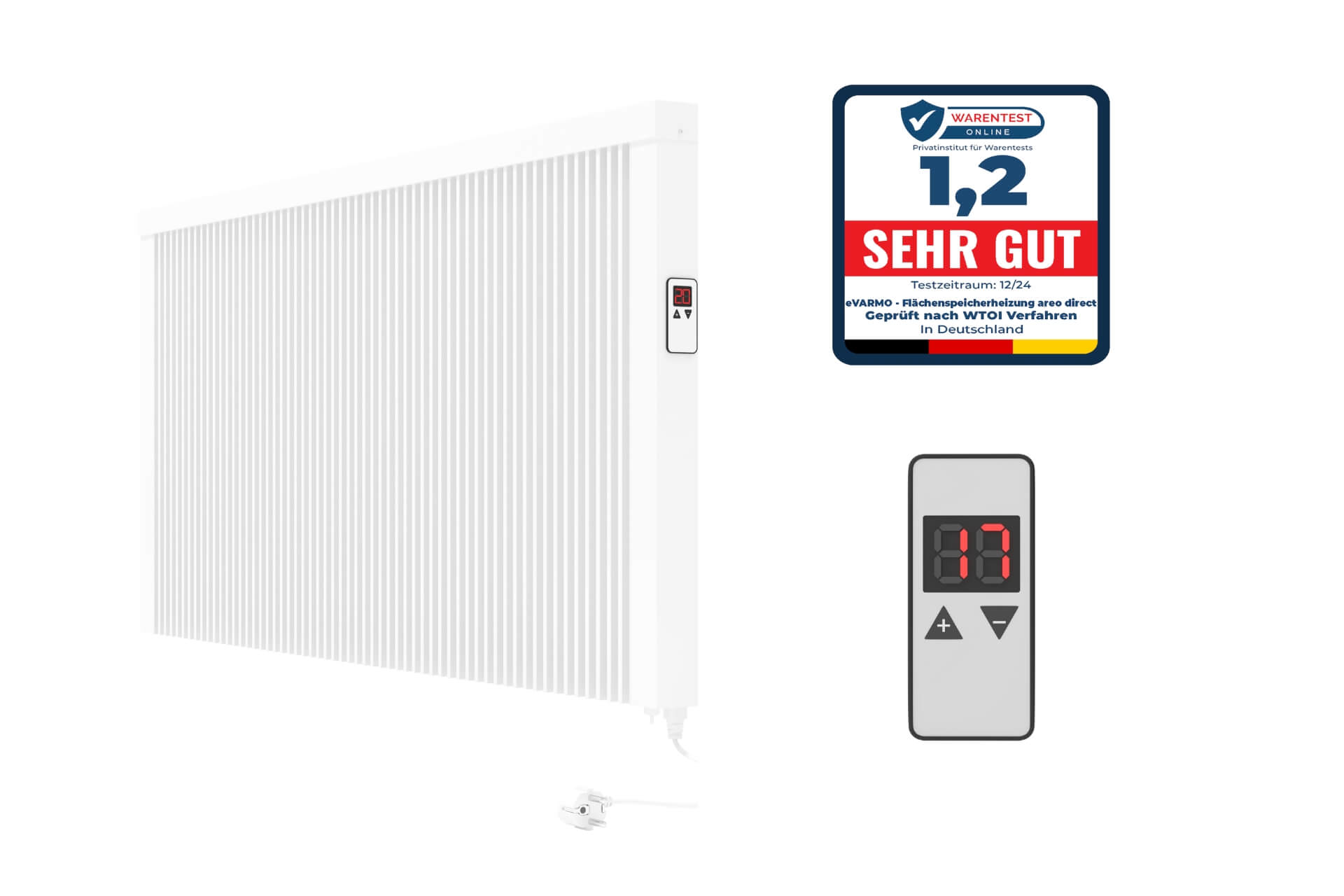 Die areo direct Flächenspeicherheizung wurde im Dezember 2024 von Warentest online überprüft und mit der sehr guten Note 1,2 bewertet. Sie besticht durch ihre hochwertige Verarbeitung, einfache Handhabung und modernes Design.