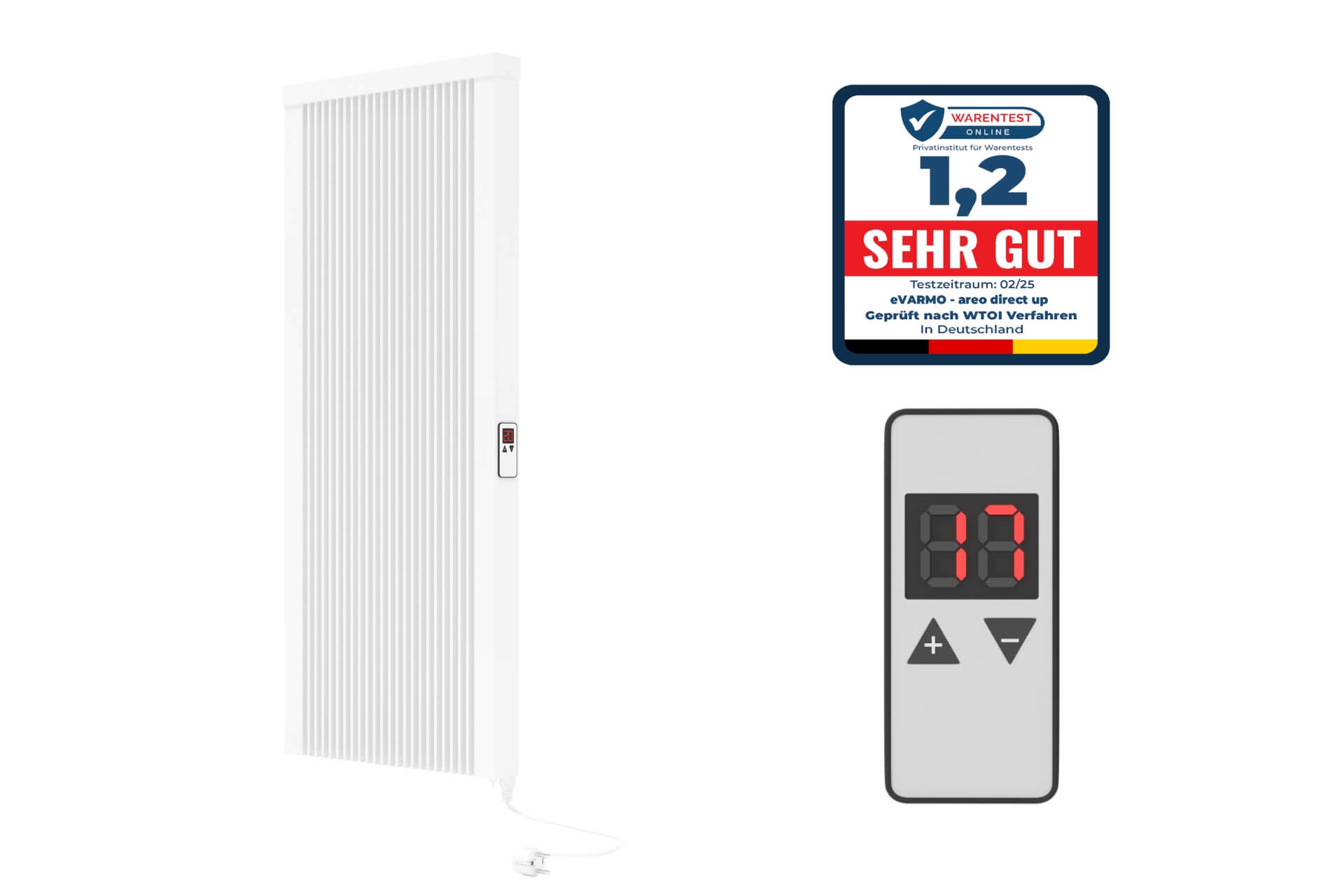Die hohe Flächenspeicherheizung areo direct up erhielt im Februar 2025 eine ausgezeichnete Bewertung von Warentest online, einem unabhängigen Privatinstitut für Produkttests. Mit der Top-Note 1,2 überzeugt das Produkt durch Qualität, Benutzerfreundlichkeit und Design.